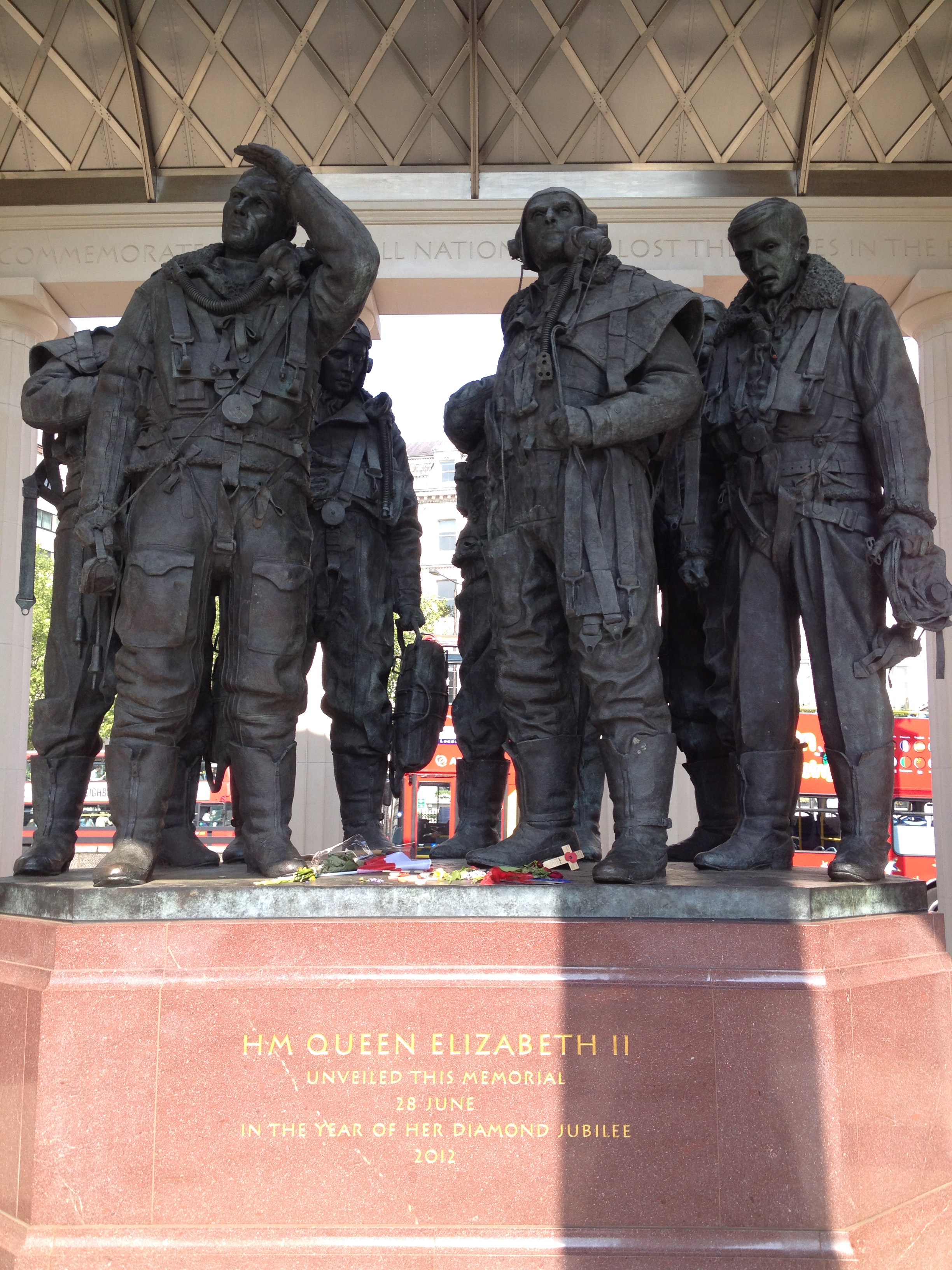 If you are passing across from Buckingham Palace towards Hyde Park Corner or sitting in a London double-decker bus from Hyde Park Corner or Marble Arch along Piccadilly you will see the impressive and new Bomber Command Memorial in Green Park, made in a modern and classical style in Portland stone.
