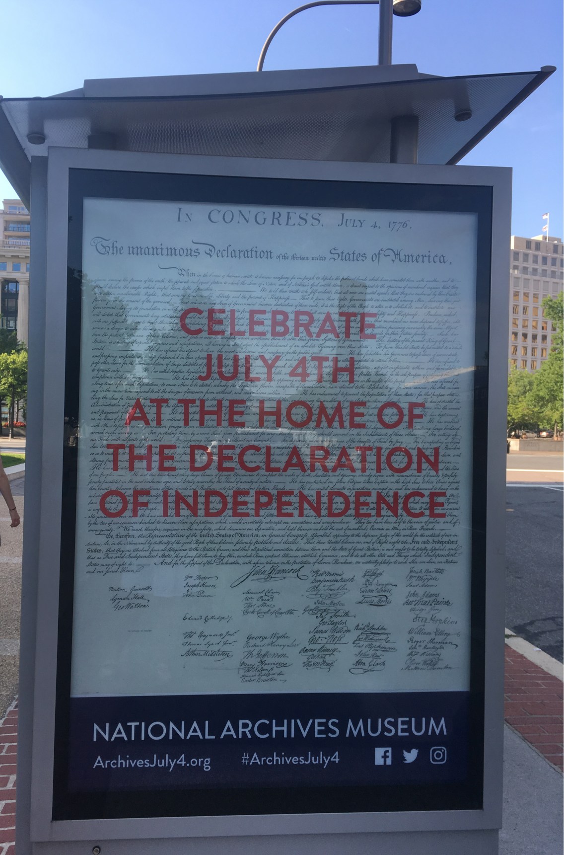 A bus stop poster in the DC capitol area on The Declaration of Independence document shown in The National Archives