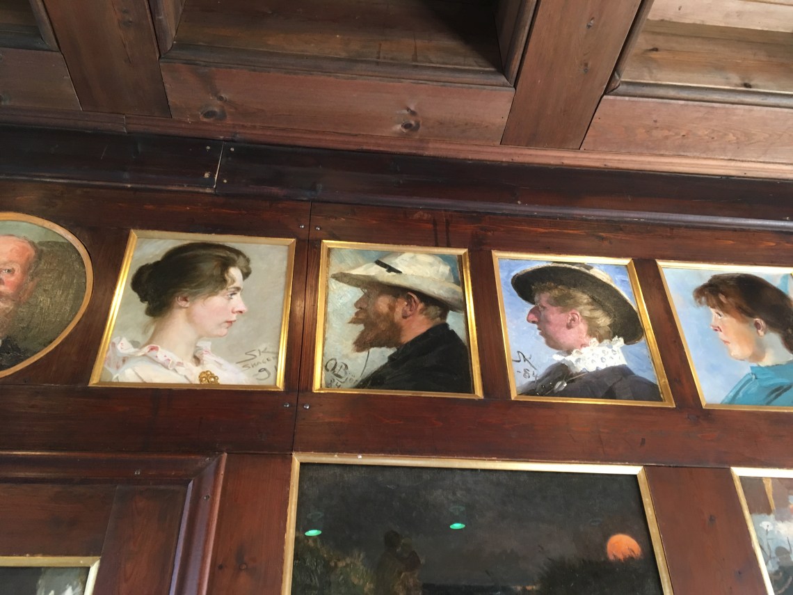 The wooden panels at the former dining room at Broendum’s Hotel at Skagen Museum. Marie and P.S. Kroeyer first from the right