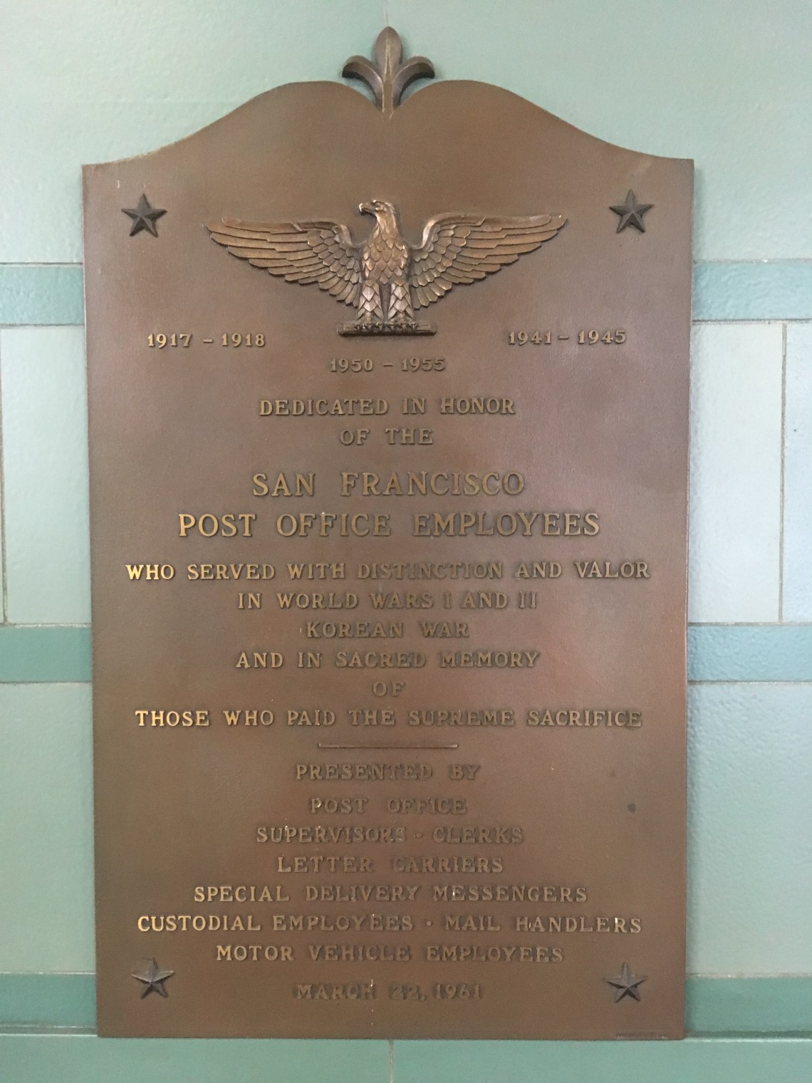 A war memorial in the Rincon Annex for post office employed who served in the two World Wars and the Korean War