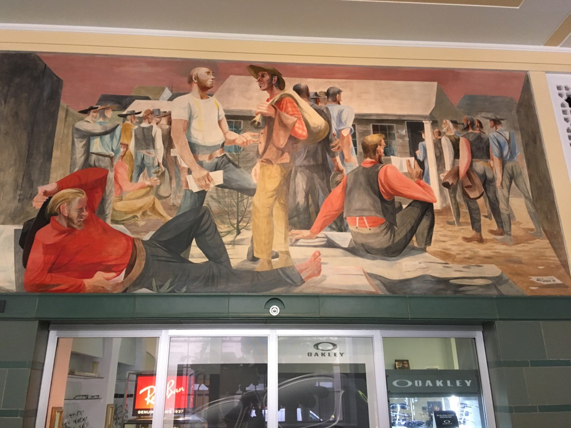 ‘Pioneers receiving mail by ship. Later trains delivered postage on the Transcontinental Railroad from 1869’