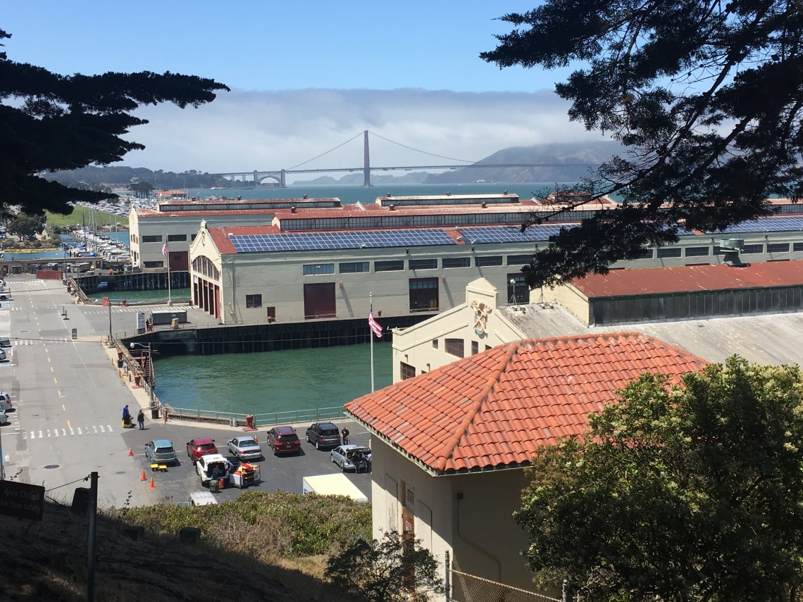 View to Fort Mason with the Golden Gate Bridge in the background along the San Francisco Bay