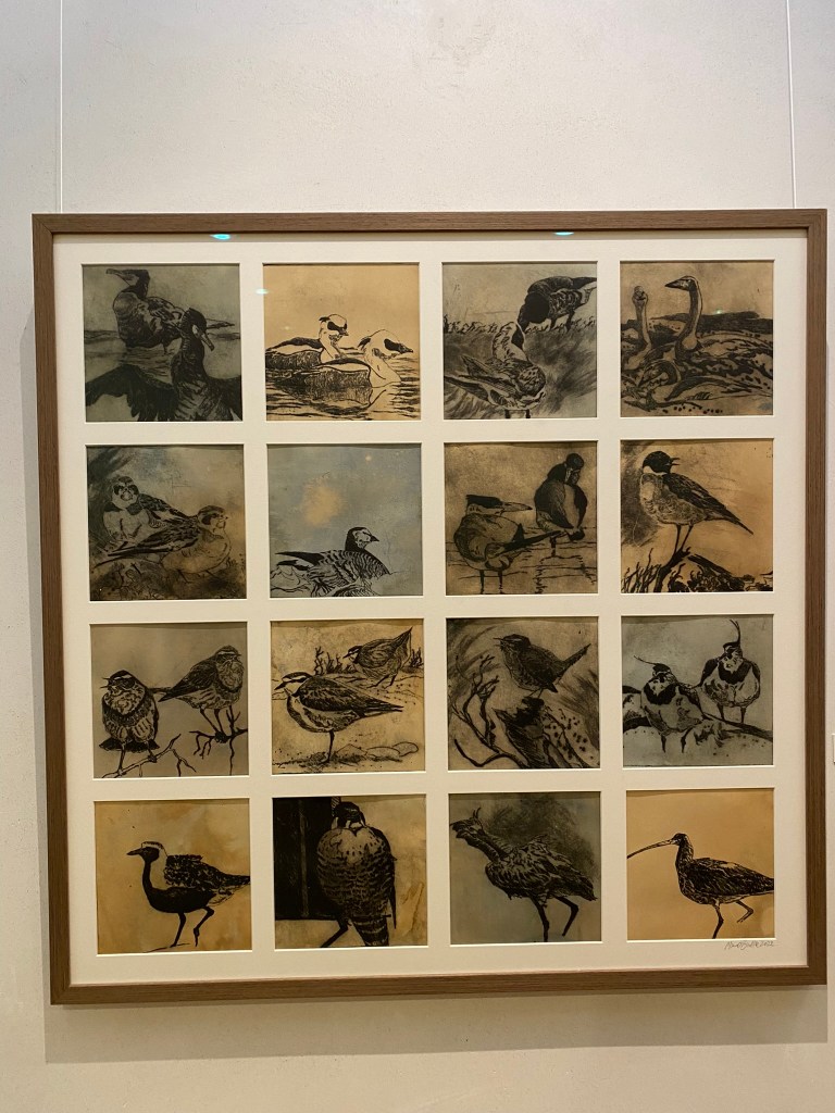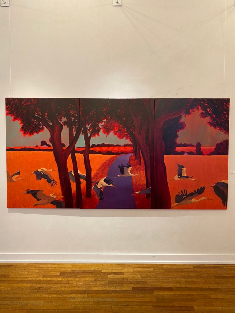Simon Bang is our good friend. He is both a gifted painter and filmmaker on historical subjects. His large painting “Landscape with 9 Storks 2021” had a central place at the exhibition. We had a guided tour of the works, and the guide mentioned that people objected to the number of storks. The tenth bird is not a stork, though.